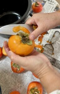「柿のヘタまでぐっと包丁を入れてね」と言われても…なかなかコツがつかめず苦戦!